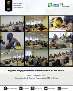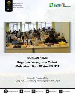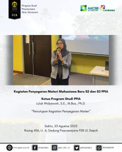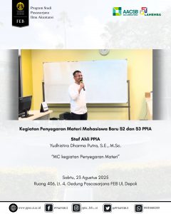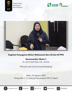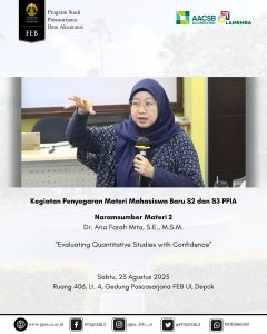 Sabtu, 23 Agustus 2025 – Kegiatan Penyegaran Materi bagi mahasiswa baru program S2 dan S3 PPIA FEB UI telah berlangsung dengan lancar, interaktif, dan penuh antusiasme. Acara ini menghadirkan narasumber dari Departemen Akuntansi FEB UI, yaitu Ibu Dr. Aria Farah Mita, S.E., M.S.M. dan Ibu Miranti Kartika Dewi, S.E., M.B.A., Ph.D.
